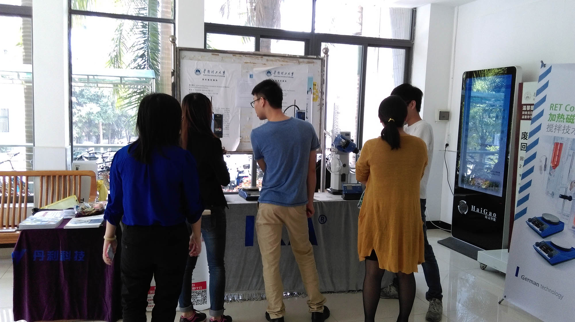 從早上8點開始,大家就按照預先的方案,有條不紊地擺放好宣傳桌,安裝擺放好儀器樣品,掛出宣傳海報和易拉寶等,并在現(xiàn)場發(fā)放宣傳單,主動引導老師學生到我們的展臺前更多的了解我們的產(chǎn)品,參與我們的活動,售后服務工程師也去到事先登記的實驗室進行儀器的檢修工作。