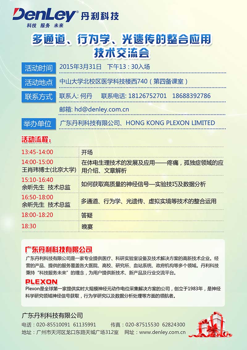 2015年3月31日下午13:30廣東丹利科技有限公司將在中山大學(xué)北校區(qū)醫(yī)學(xué)科技樓西740(第四備課室)舉辦多通道、行為學(xué)、光遺傳的整合應(yīng)用技術(shù)交流會。