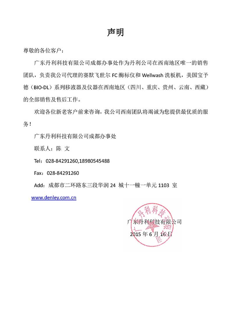 尊敬的各位客戶: 廣東丹利科技有限公司成都辦事處作為丹利公司在西南地區(qū)唯一的銷售團隊,負責我公司代理的賽默飛世爾FC酶標儀和Wellwash洗板機,美國寶予德(BIO-DL)系列移液器及儀器在西南地區(qū)(四川、重慶、貴州、云南、西藏)的全部銷售及售后工作。